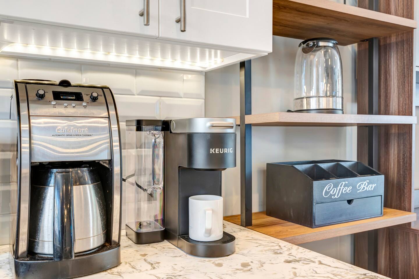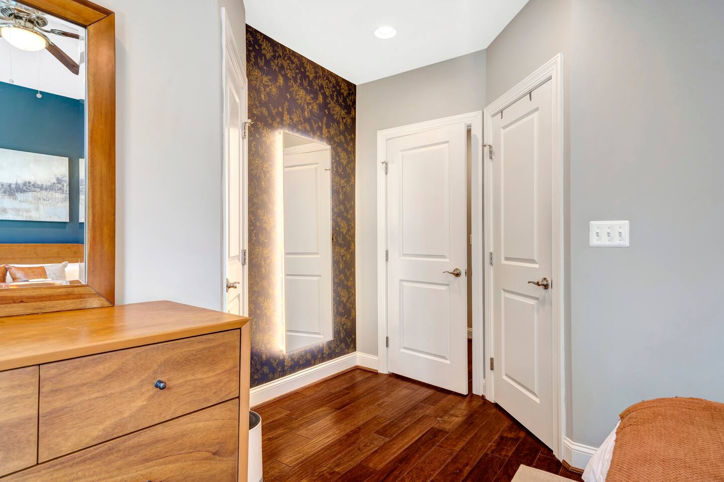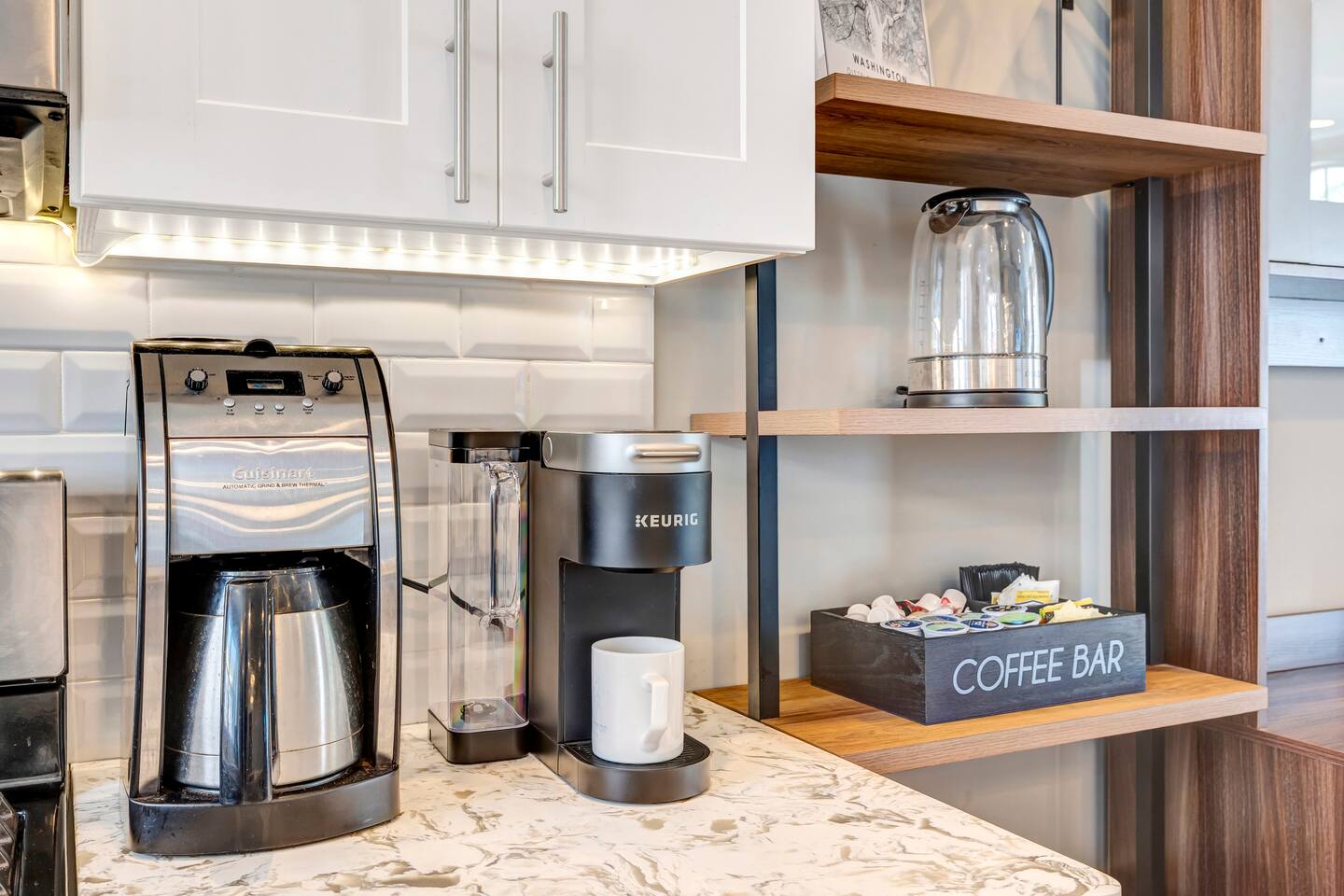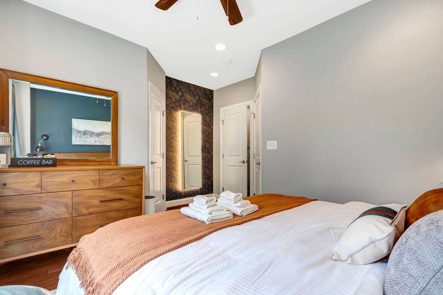 • Primary Suite (2nd floor, King bed): This spacious suite features a Helix king bed, hospitality linens, and a unique mirror wall to help you get ready for the night ahead. Don't forget the coffee bar to get that morning caffeine fix!